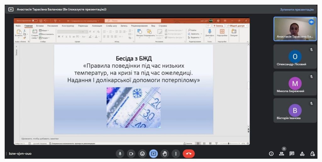 5 грудня 2023 року класним керівником групи Пб11 була проведена бесіда з БЖД на тему "Правила поведінки під час низьких температур, на кризі та під час ожеледиці. Надання І долікарської...