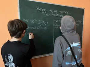 Студенти об’єдналися у дві групи та взяли участь у невеликому змаганні. Кожна команда отримала завдання заповнити таблицю із різними життєвими ситуаціями та визначити, як поводиться людина без лідерських якостей і як у таких обставинах діє справжній лідер. Команди активно обговорювали відповіді, пропонували свої варіанти та аргументували власну думку.