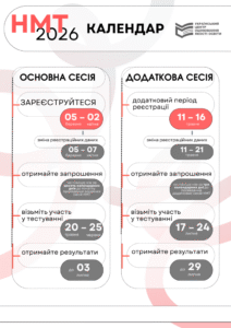 Наказом Міністерства освіти і науки України затверджено Календарний план організації та проведення у 2026 році національного мультипредметного тесту (НМТ). Радимо потенційним учасникам та учасницям заздалегідь зафіксувати важливі етапи проведення НМТ в особистому календарі.